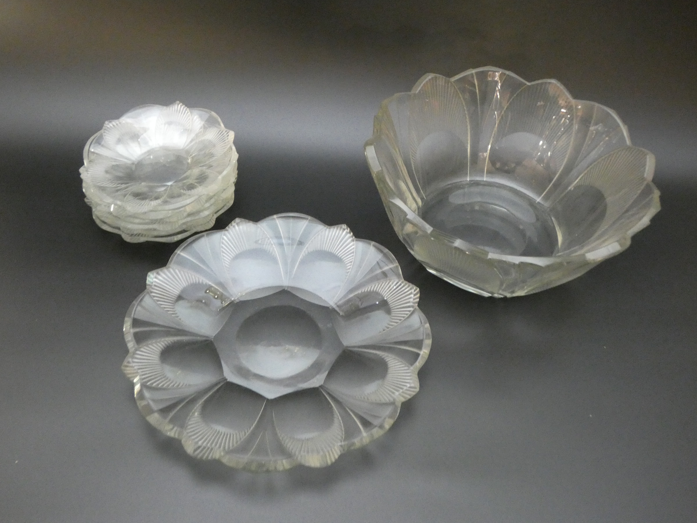 Dezertní souprava, lisované sklo Obsahuje: šest malých talířků , jeden velký tác a hluboká miska,perfektní, bez poškození