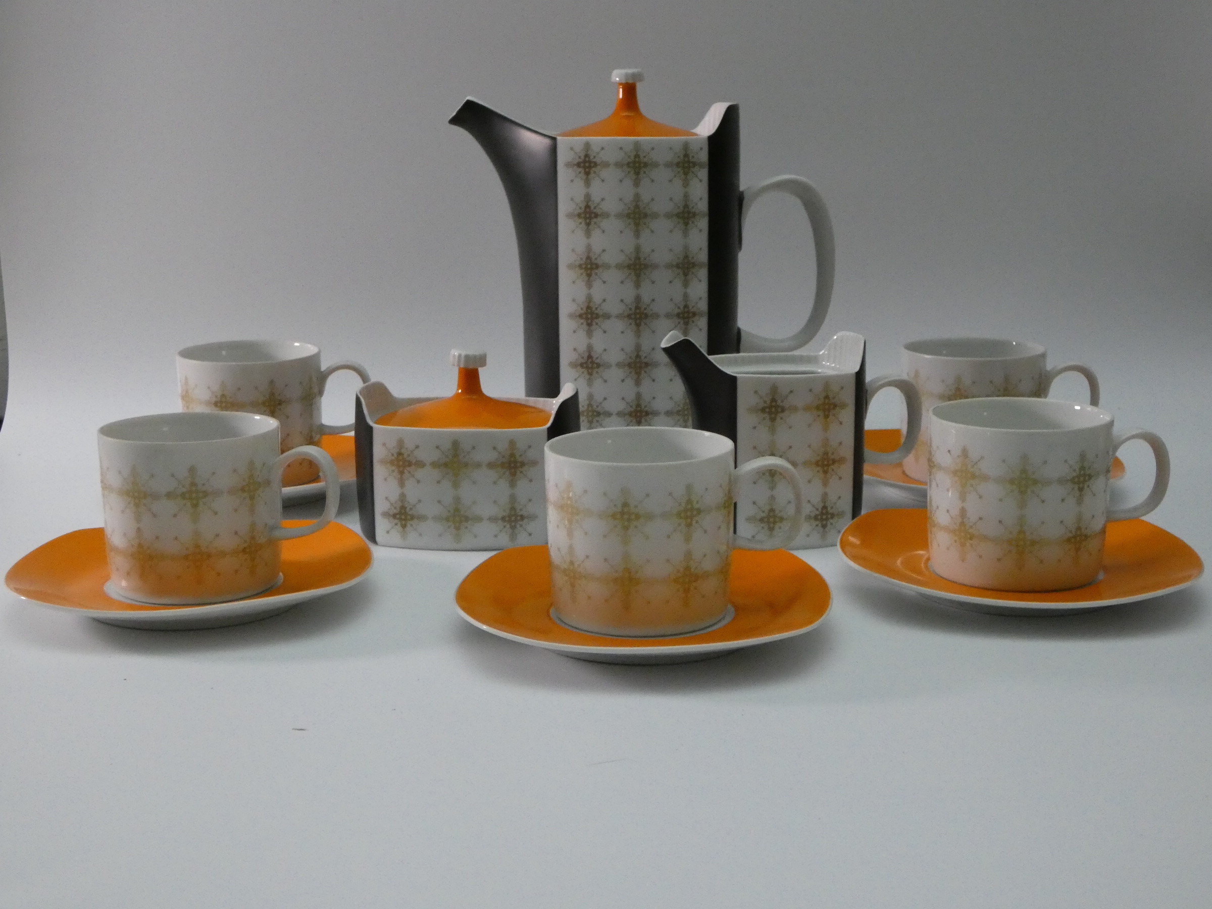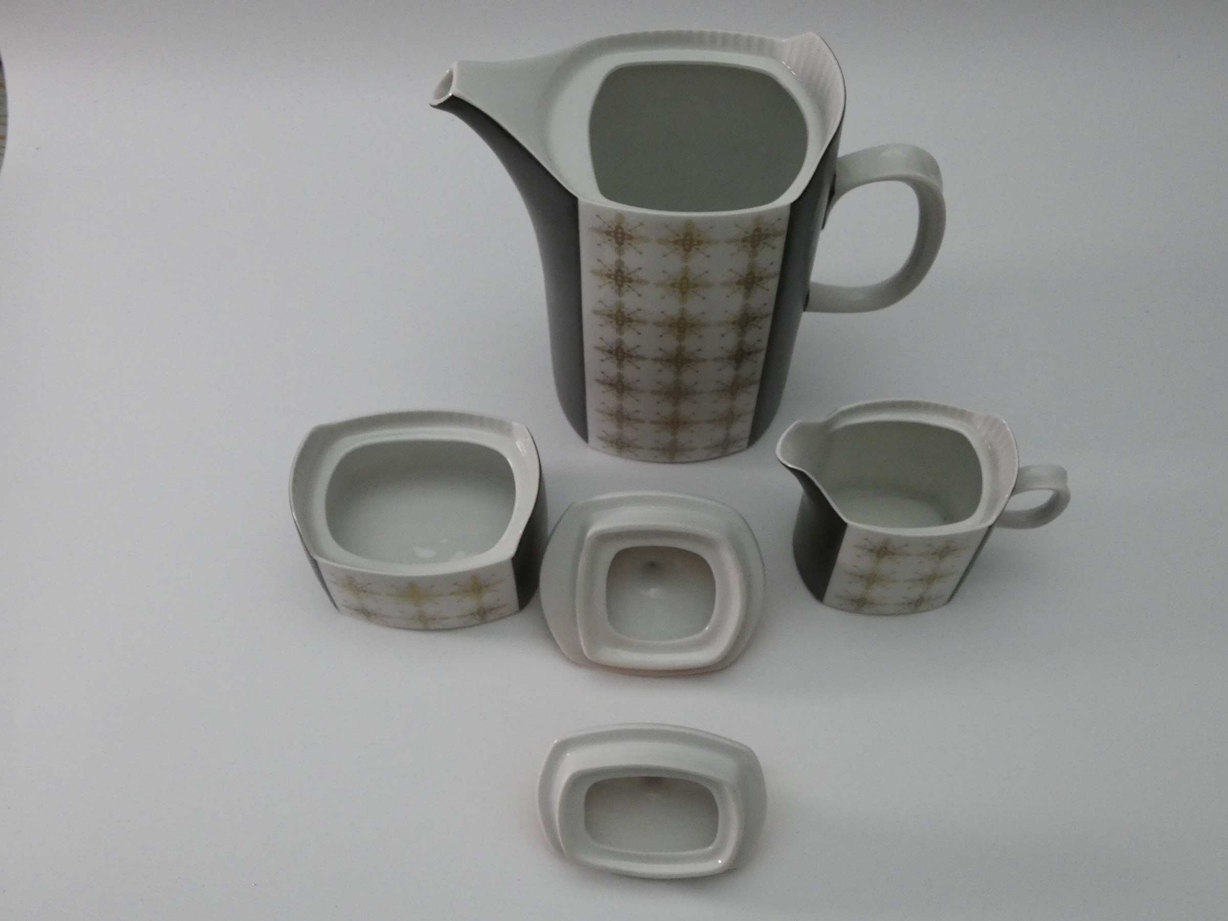 Porcelánová kávová souprava Sidonia, designer Jaroslav Ježek, porcelánka Loučky. Souprava obsahuje: 5 šálky a 5 podšálky, konvici, mléčenku a cukřenku,krásny stav